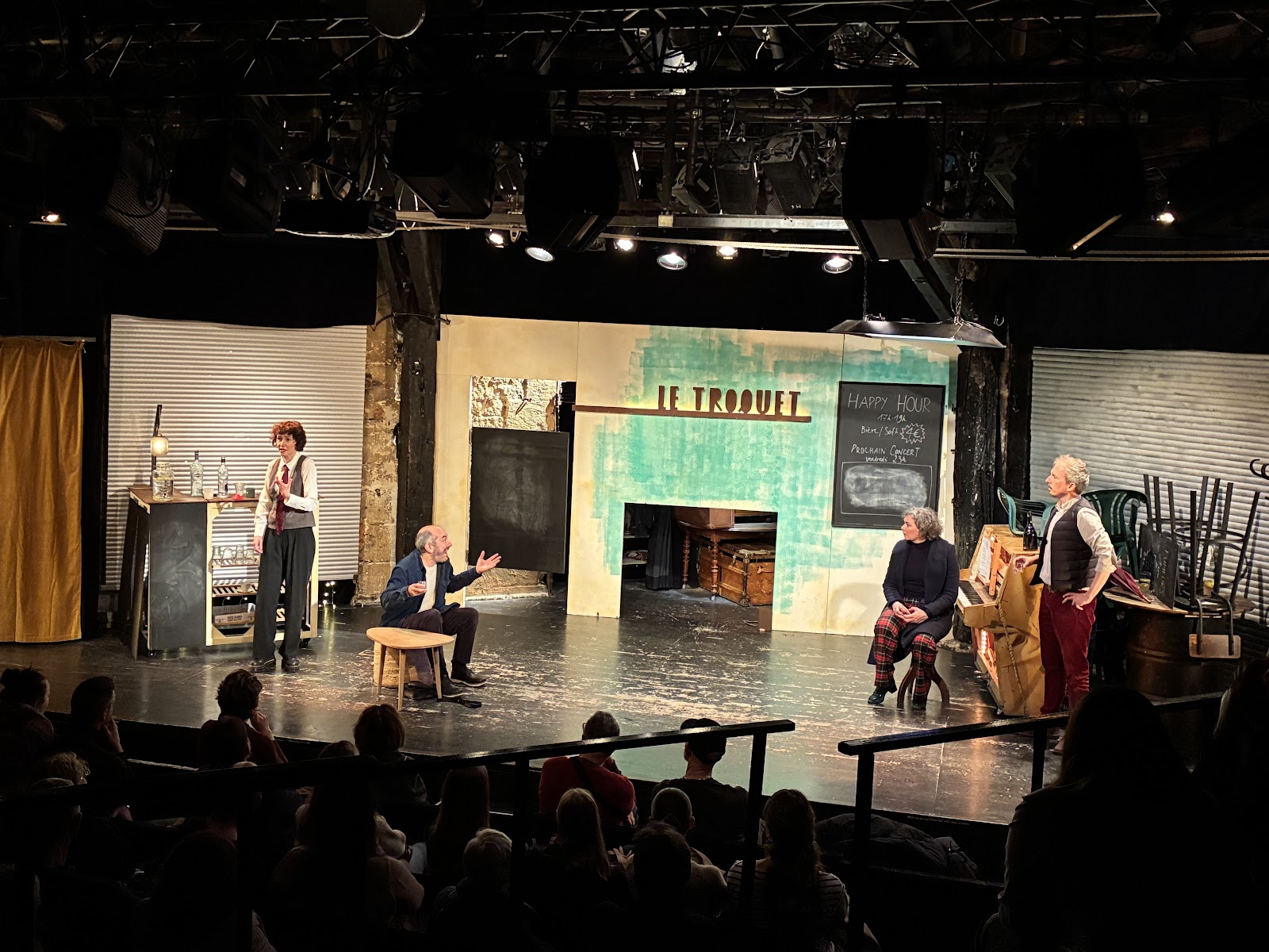Theatre performance exploring themes of emergency and crisis at Cafe de la Gare, a experimental venue in Paris's 11th arrondissement.