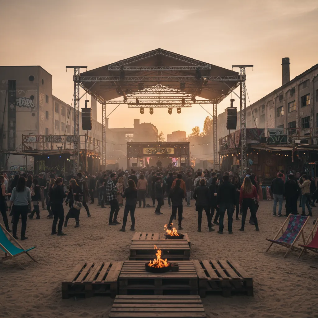 Terreno industrial reconvertido en micro-festival permanente en Lichtenberg: varias pistas, playa, bar hippie, fuego y open end extendido. Viernes y sábado todo el fin de semana.