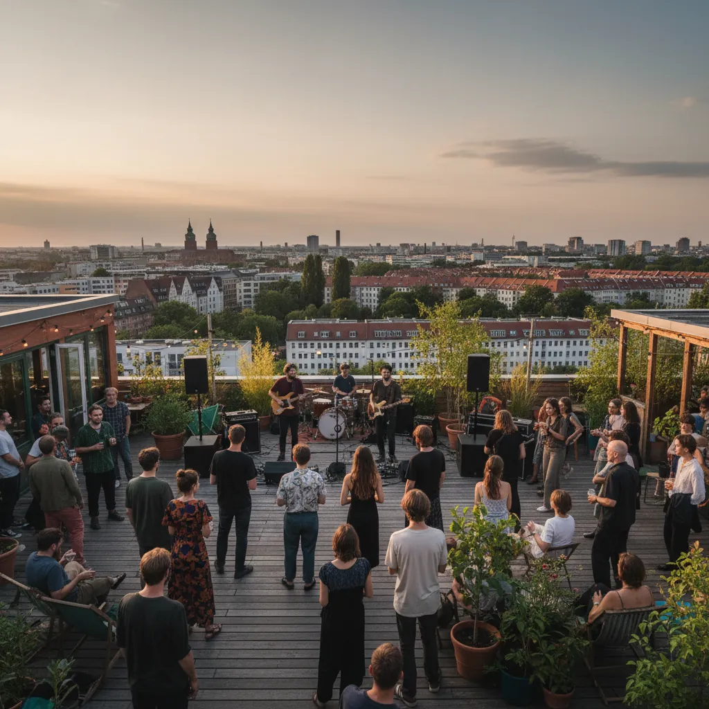 Dachterrassen-Bar-Garten im Neukölln Arcaden mit DJ-Sets, kleinen Konzerten und Open-Air-Nächten über Berlin.