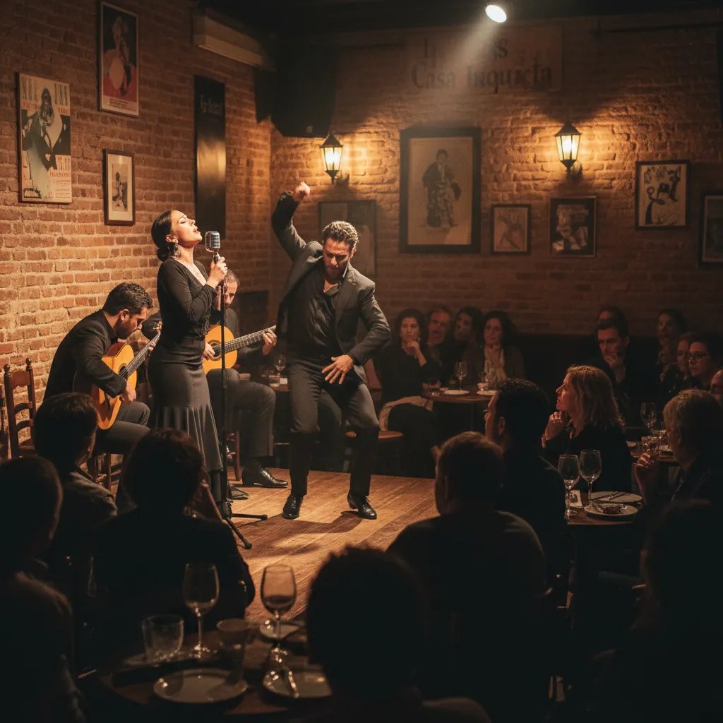 Tablao íntimo en Casa Inquieta con aforo reducido. Dos pases por noche centrados en el duende del cante y el baile.